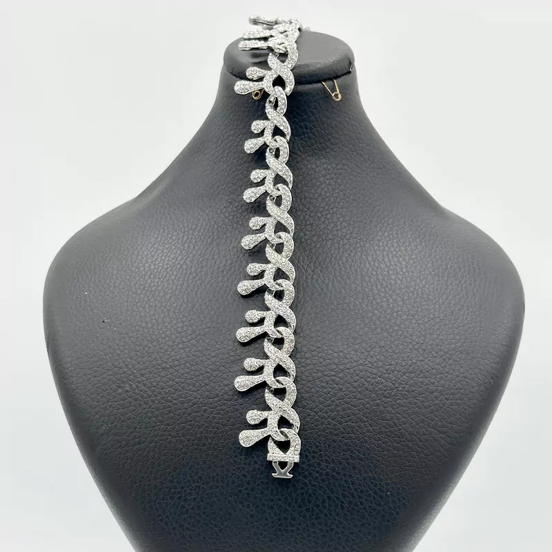 این اکسسوری باشکوه با چیدمان متراکم نگین‌های درخشان، نوری خیره‌کننده ساطع می‌کند که حتی در کم‌نورترین فضاها نیز دستان شما را به کانون توجه تبدیل می‌کند. طراحی این دستبند به گونه‌ای است که حس لوکس بودن و اعتمادبه‌نفس را در وجود شما بیدار کرده و استایلی اشرافی و متمایز به شما می‌بخشد.