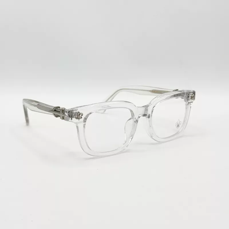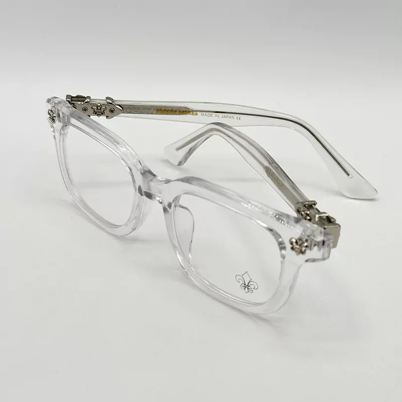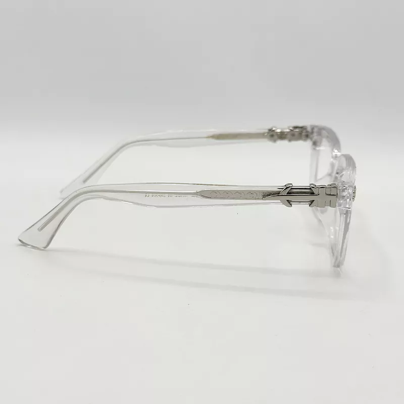 در حالی که جزئیات نقره‌ای و نمادین برند Chrome Hearts در کناره‌های فریم، اصالت و استایل لاکچری شما را به رخ می‌کشد. اگر به دنبال طراحی گوتیک مدرن هستید که هم در جلسات رسمی و هم در محافل دوستانه امضای شخصی شما باشد، این عینک شفاف بهترین انتخاب برای باز تعریفِ وقار شماست.