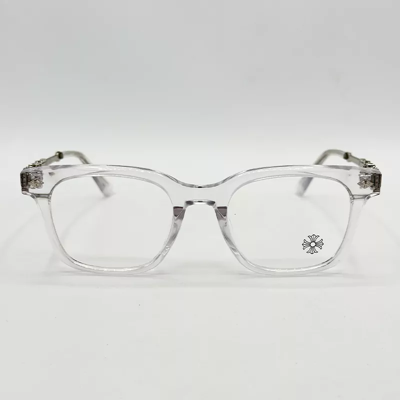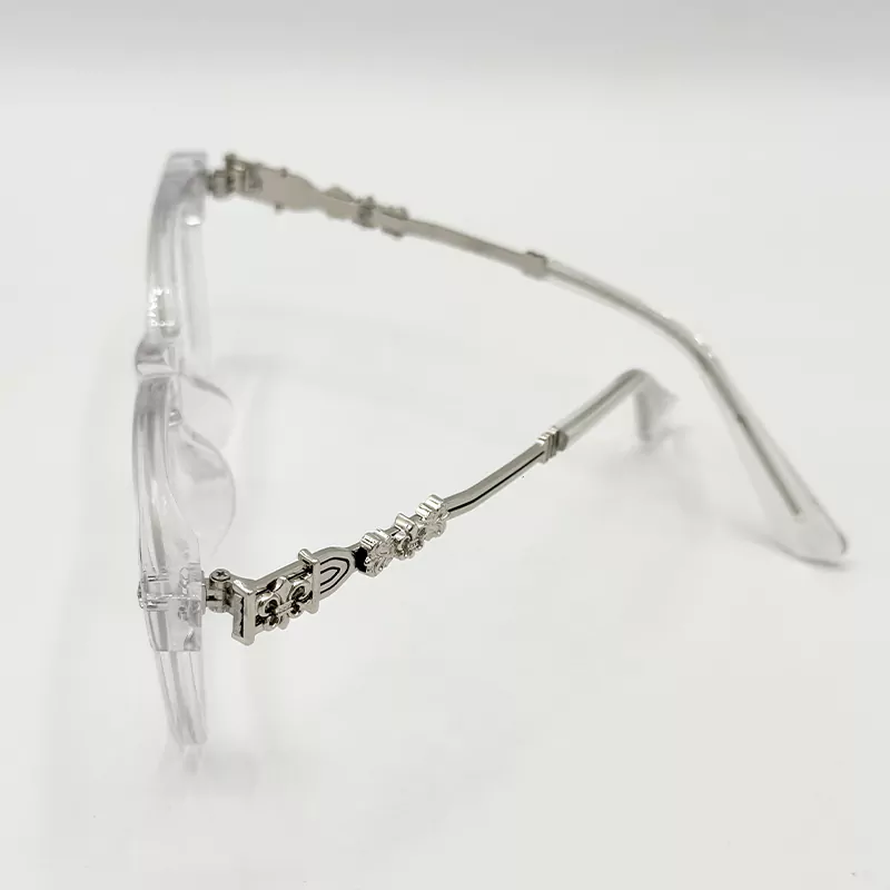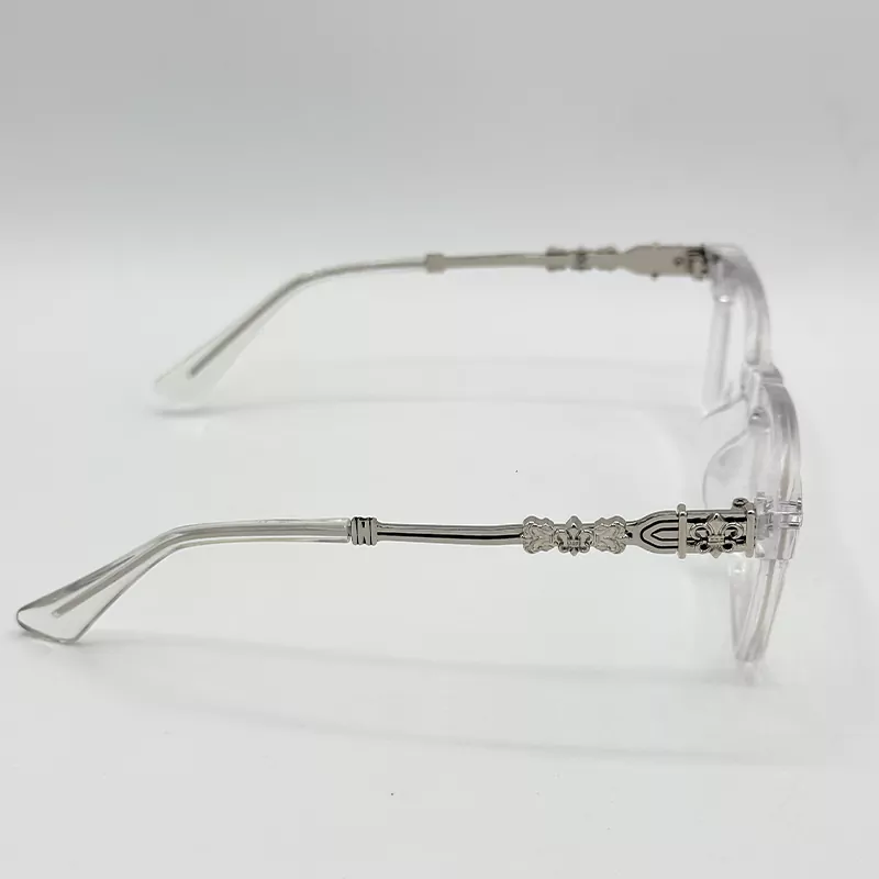 در حالی که جزئیات نقره‌ای و نمادین برند Chrome Hearts در کناره‌های فریم، اصالت و استایل لاکچری شما را به رخ می‌کشد. اگر به دنبال طراحی گوتیک مدرن هستید که هم در جلسات رسمی و هم در محافل دوستانه امضای شخصی شما باشد، این عینک شفاف بهترین انتخاب برای باز تعریفِ وقار شماست.